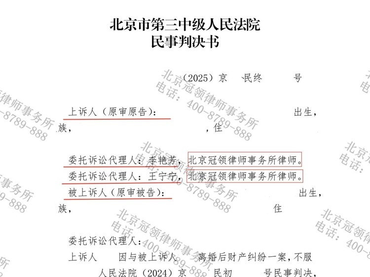 2024年5月,北京朝阳的李女士因在离婚财产分割中,因一笔款项的性质与前夫王先生产生争议,求助到北京冠领律师事务所。在冠领律师的专业代理下,案件历经两审,二审法【查看全文】