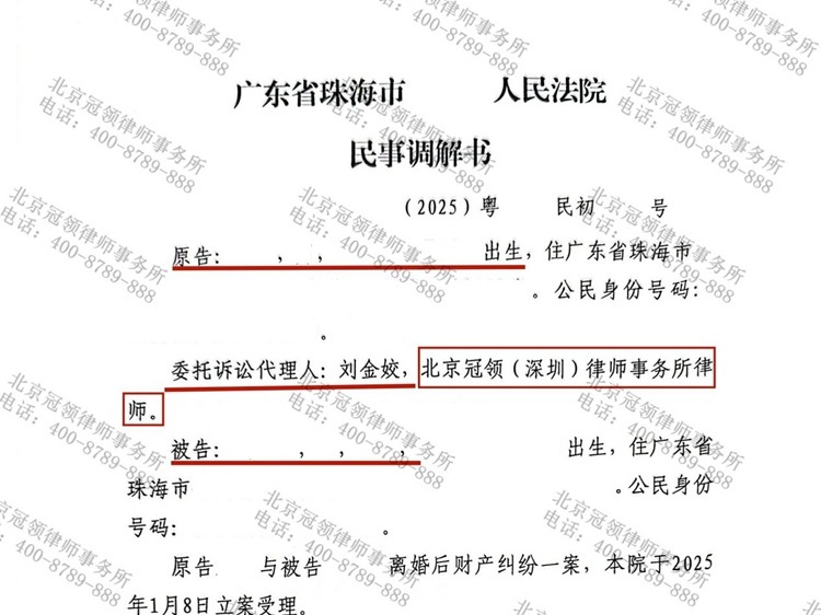 2025年1月,珠海市某区人民法院成功调解一起涉及离婚后财产分割的纠纷案件。在北京冠领(深圳)律师事务所律师的专业协助下,当事人张彬与岳兰达成由岳兰向张彬分期支【查看全文】