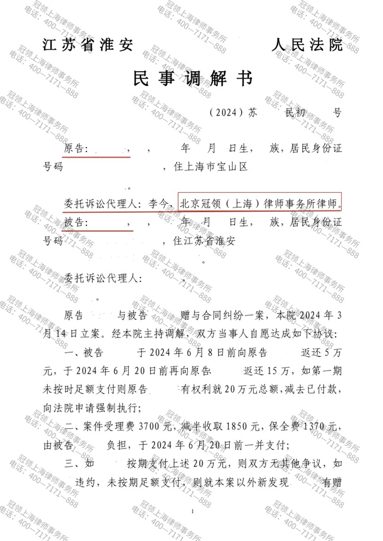 最终,在法院的主持调解和冠领律师的努力下,赵晴与廖欢欢的纠纷得到了化解。经法院出具的《调解书》确认,廖欢欢需分期返还赵晴20万元。若廖欢欢未能按时足额支付,则赵晴有权就20万元总额,扣除已付款项后,向法院申请强制执行。若廖欢欢按期支付20万元,则双方无其他争议;若廖欢欢违约,未能按期足额支付,则赵晴有权就本案中意外发现的李树华赠与廖欢欢的其他事项,另行主张权利。