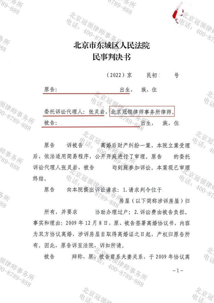 徐女士与朱先生原为夫妻关系,双方于2009年签署了《离婚协议书》,其中约定离婚后当地某套登记在朱先生名下的房产应归徐女士所有。然而由于种种原因,该房产一直未办理过户手续。为此,徐女士求助到北京冠领律师事务所,张灵岩律师受律所指派代理本案。