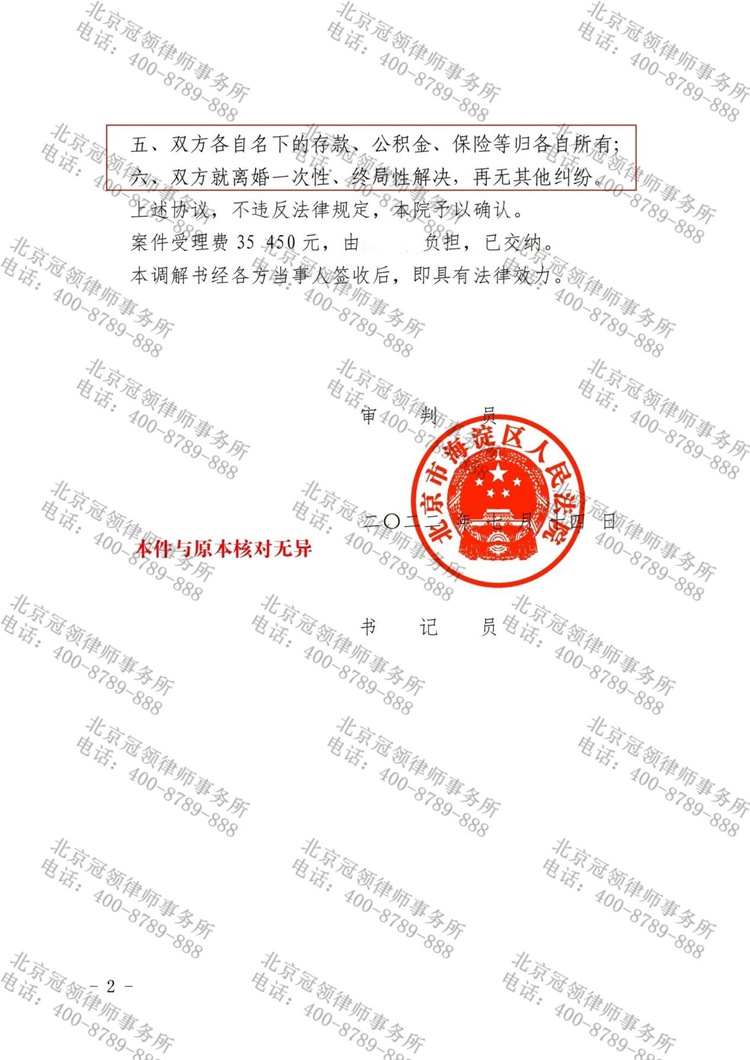接受指派后,冠领律师详细了解了胡女士夫妻的财产及家庭情况。其中,购买北京朝阳区的房屋时动用了胡女士的婚前财产,遂登记在胡女士名下;海南的两套房屋系儿子小高出资,小高并非高先生亲生,亦全部登记在胡女士名下。为了保证胡女士的利益最大化,冠领律师建议胡女士起诉后先行调解。得到胡女士认可后,冠领律师在办案过程中一边与承办法官沟通案情,一边抓住对方的薄弱环节说服对方同意调解。