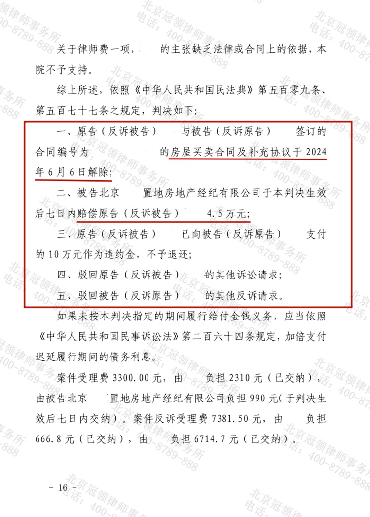 2023年9月,杨女士代女买房签合同付定金后,因中介介绍房屋情况不实要求解约退款,后委托冠领律所诉讼维权。诉讼中,卖家李某反诉索赔百万违约金,冠领律师收集证据,据理力争。2024年,法院判决合同解除,中介赔偿4.5万元,驳回李某索赔。冠领律师成功帮助杨女士减轻经济损失。