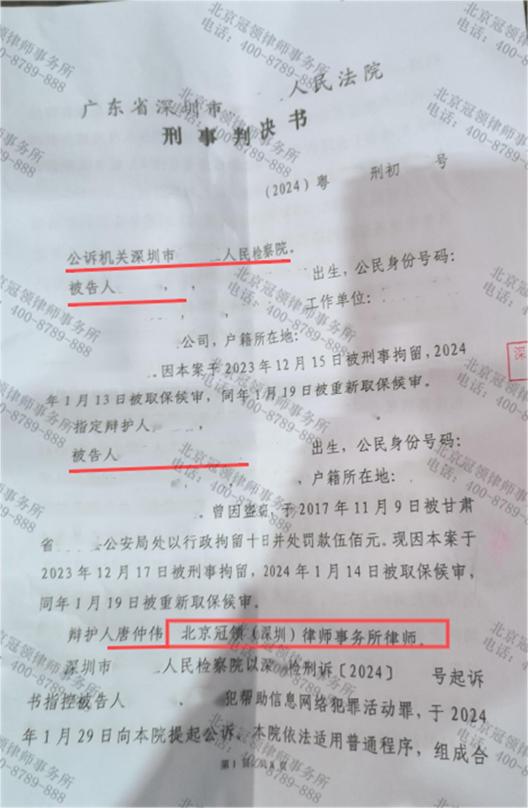 近期,冠领律师担任辩护人的深圳市某区一起帮助信息网络犯罪活动案取得关键成果。本案中,律师紧扣当事人的从犯地位、缺乏主观故意及自首情节,通过多次与检察机关沟通,提交证据分析及类案报告,最终使法院采纳冠领律师辩护意见,判处被告人拘役三个月,缓刑五个月。