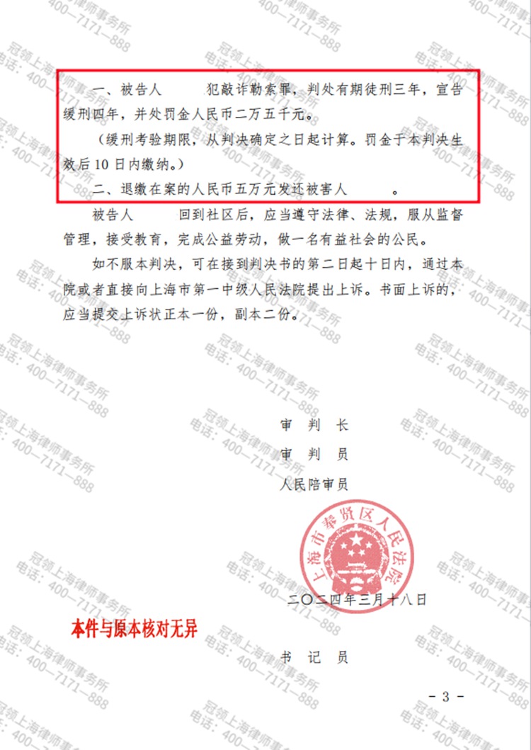 2023年9月,上海市奉贤区某企业法定代表人李某报案称,于某以举报其公司违规经营相威胁,索要钱款10万元,实际收取5万元。同年10月,于某因涉嫌敲诈勒索罪被上海市公安局奉贤分局采取刑事拘留措施。2024年3月,经上海市奉贤区法院审理,在冠领律师的专业辩护下,于某最终被判处有期徒刑三年、缓刑四年,并处罚金2.5万元,退缴款项发还被害人。