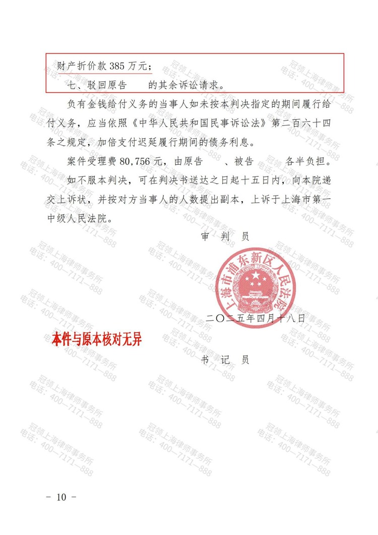 法院经审理,支持了冠领律师的代理意见,认为徐先生的赔偿主张证据不足,故判决准予徐先生与刘女士离婚,双方名下的房产、存款、债务等归各自所有,徐先生限期向刘女士支付房屋折价款385万元,驳回徐先生的其他诉讼请求。刘女士总计分得500万元财产。