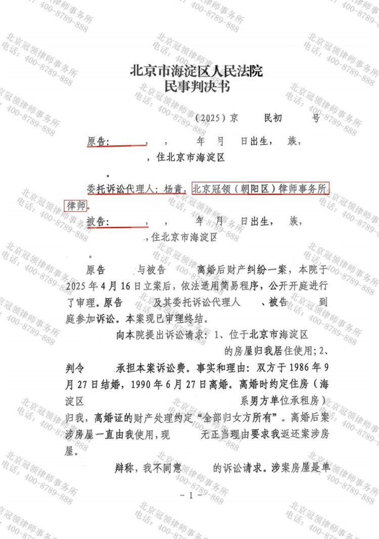 2025年5月,北京市海淀区人民法院对一起跨越35年的离婚后财产纠纷案作出判决,认定卢女士与贺先生签订的离婚协议合法有效,判定案涉承租房在贺先生承租期内,由卢女士继续居住使用。在冠领律师的介入下,成功捍卫了委托人卢女士的合法权益。